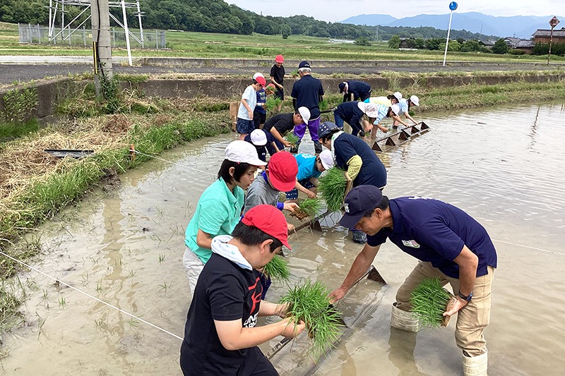 5年生で行われる社会科の農業学習プログラムには、1泊2日の「ふるさと体験学校」があります。「田植え」と「稲刈り」の時期に年2回、同じ場所を訪れ、農家のご家庭にお世話になりながら様々なことを学びます。