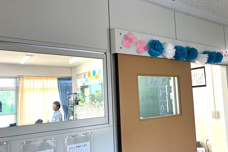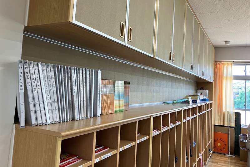 取材後、2024年にリニューアルした校舎を見学しました。新たに廊下側に窓を設置したことで風通しが良くなり、教室内は非常に明るく生まれ変わりました。また非常時の安全面を考慮して、教室の前後に大きな扉が設けられていました。児童が使用する机はA4教材に対応するため従来のものより大きくなり、ロッカーも一人につき一つ配置され、十分な大きさが確保されていました。