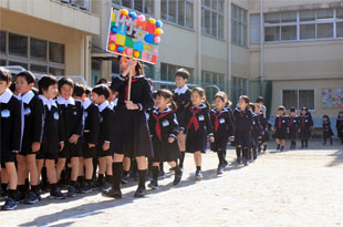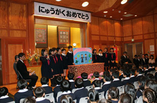 入学式を終え、新1年生を迎える会が開かれます。6年生に導かれ、宝仙学園の仲間入りをします。